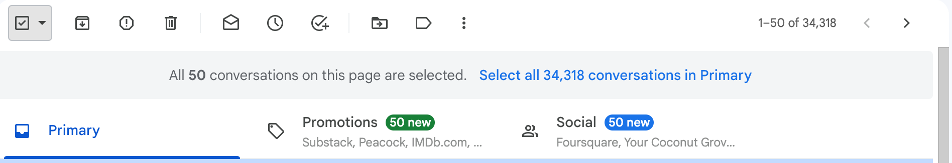 Step 1: Go to your Inbox and select ALL of the emails in your inbox. (Click the square in the upper left and make sure you hit the 'Select all X conversations' option.)