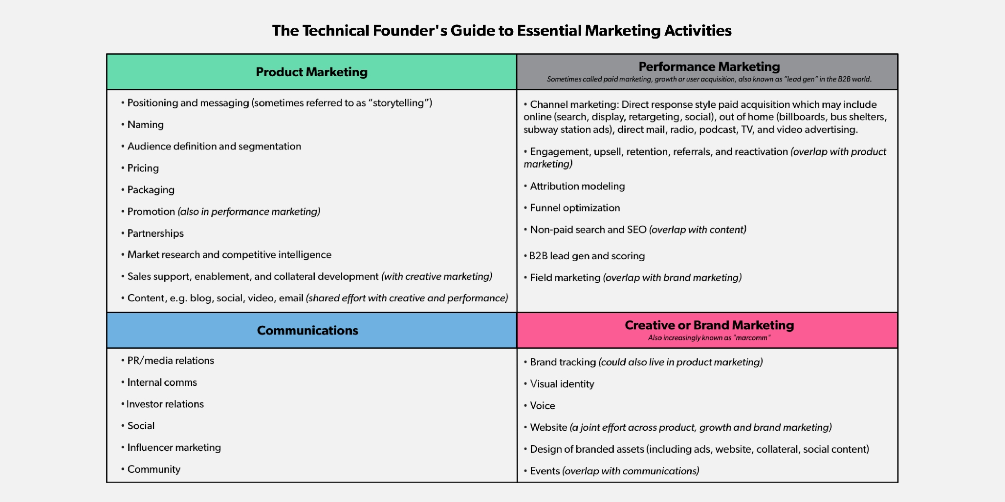 “Often times when I look at a founder’s initial marketing job description, it’s a laundry list of almost everything on that list of activities. And I know very, very few people who are strong across all of those buckets,” says Jackson.